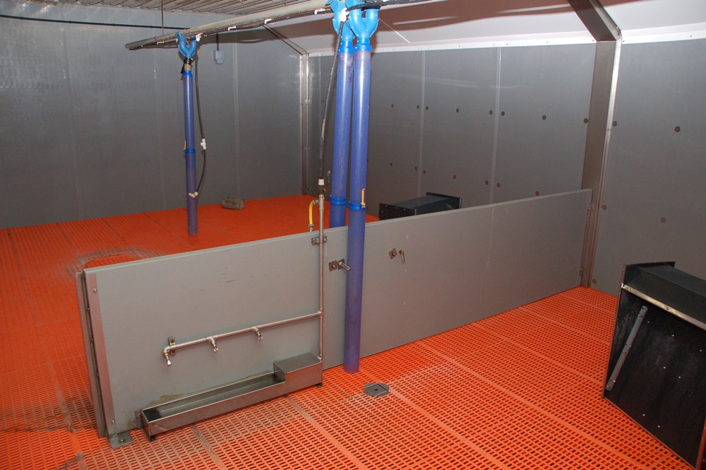 Fresh air enters the pens via a perforated ceiling and exits via a port in each room. Just two large 90cm diameter fans manage the whole building. They suck fresh air out through a chamber that runs the length of the house beneath the roof apex. This system results in a gentle airflow in each pen. Empty rooms can be isolated at the touch of a button.